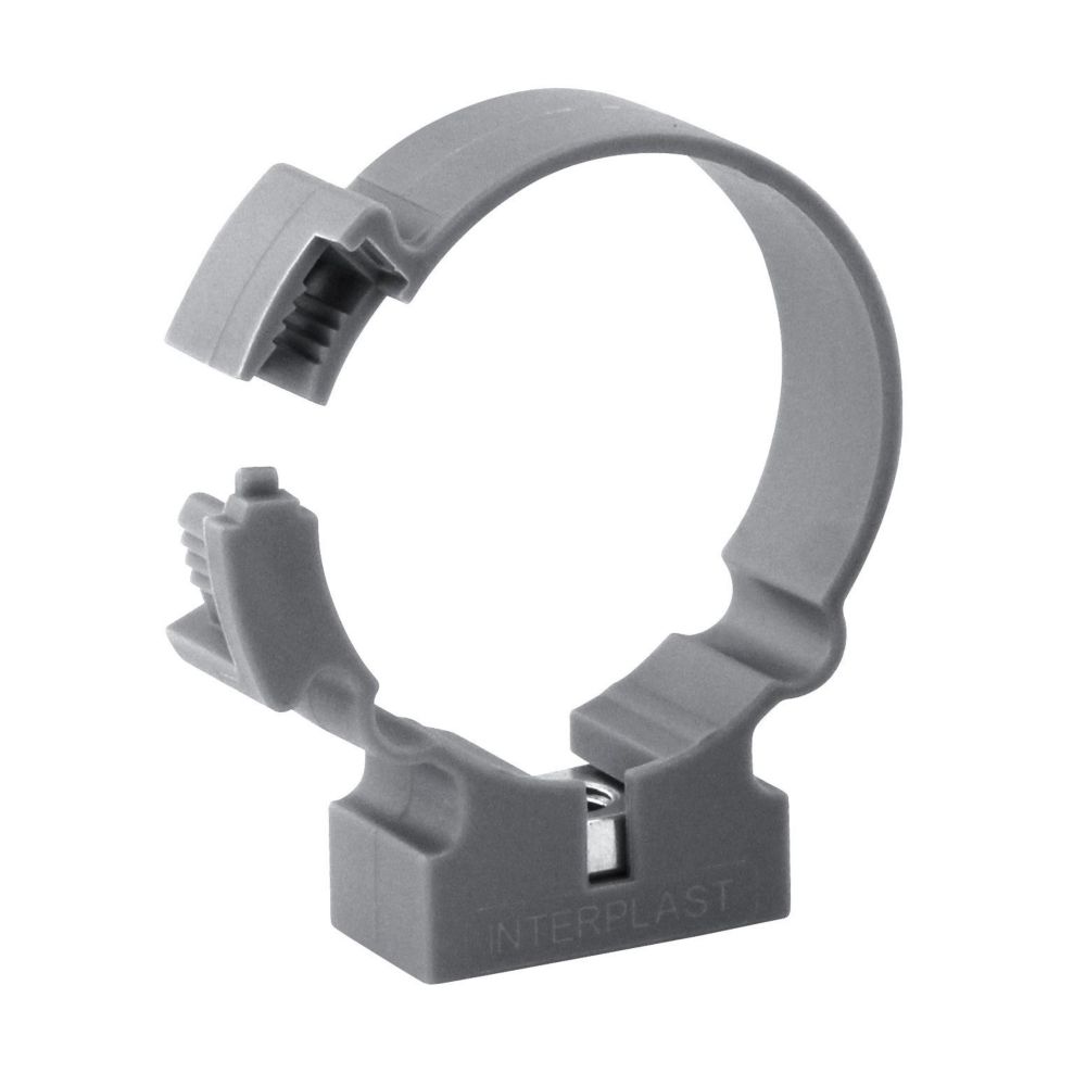 Colliers de fixation avec charnière à vis inox pour tubes d'évacuation en PVC. Ouverture et fermeture pratiques.