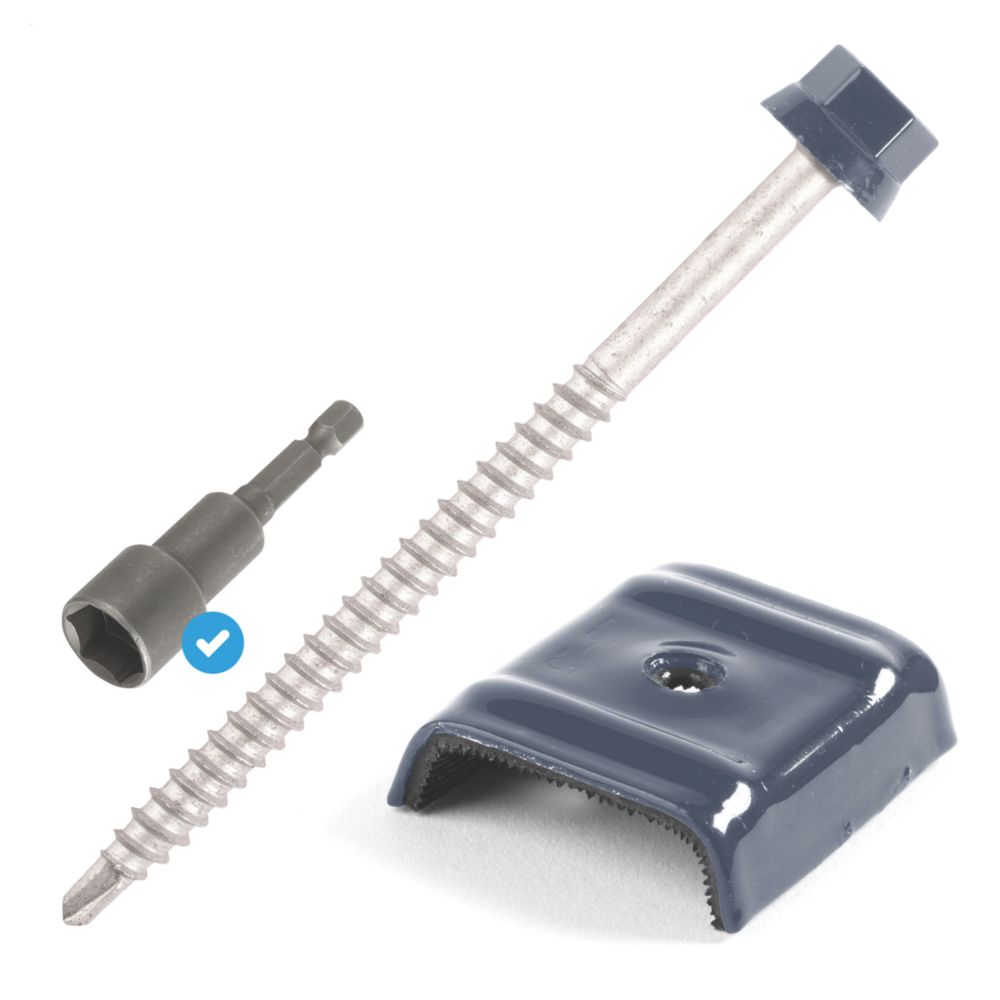 Kit complet de fixation de toiture pour bacs acier. Ce kit comprend 50 vis autoperceuses ZAMATOP-W 6,3 x L.100mm, 50 cavaliers gris anthracite RAL 5008, et 1 douille TH12 pour une fixation sûre en sommet de nervure de toiture en bac acier sur des supports en bois. Comprend des vis ZAMAC Z-FORCE HEAD avec une garantie anticorrosion de 20 ans en acier cémenté traité X-TREM COAT C2 pour une résistance supérieure. Les cavaliers sont livrés avec un joint vulcanisé intégré pour un ajustement parfait et une protection 100% anti-friction. Le revêtement en poudre offre une résistance exceptionnelle à la corrosion, à l'abrasion et aux UV. Suivez les instructions de pose du DTU 40.35 pour obtenir des résultats optimaux.