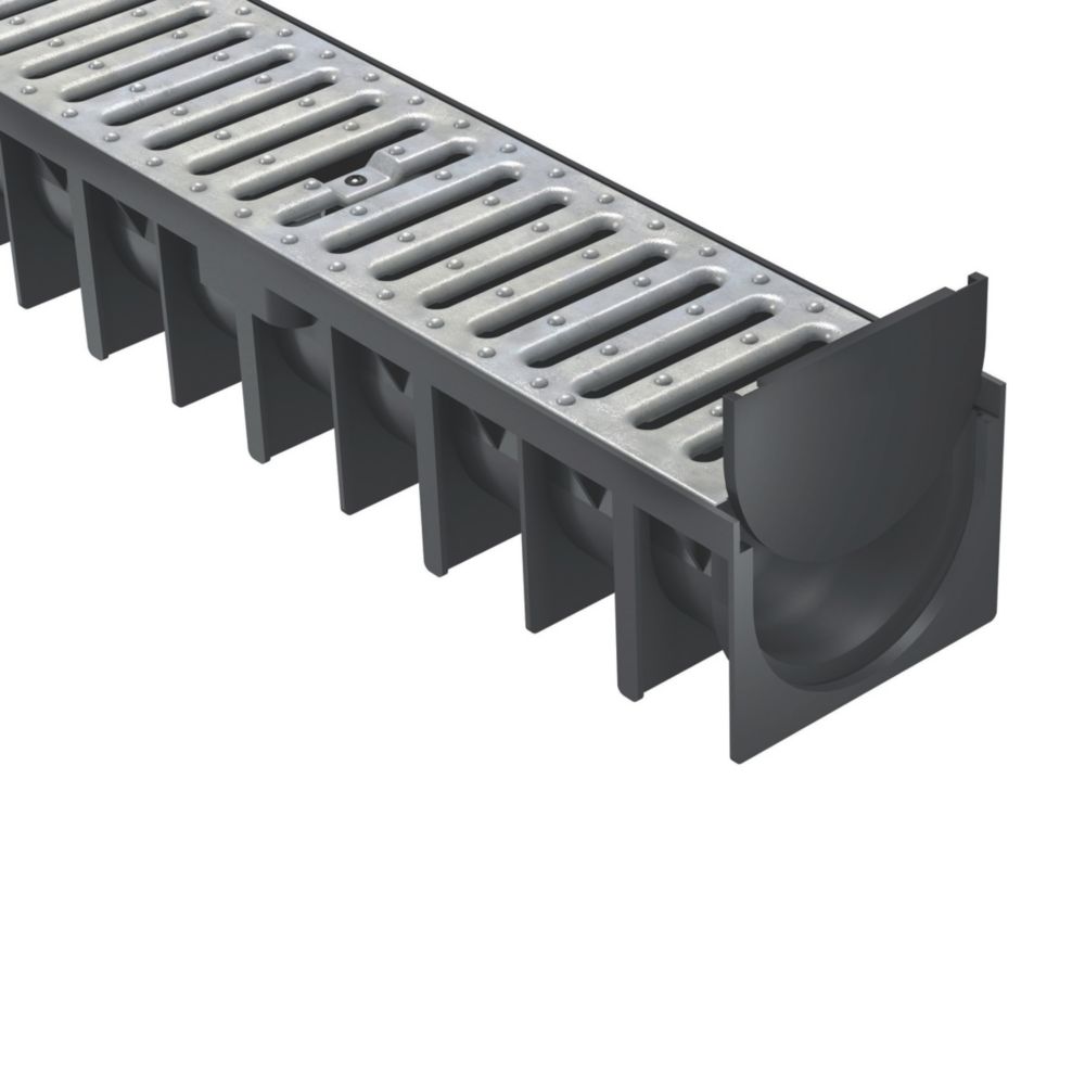 3 caniveaux de drainage en polyéthylène haute densité, avec grilles en acier galvanisé clipsables. 1m de long sur 12cm de large et 9,2cm de haut. Pour l'évacuation de l'eau de pluie et des liquides, convient aux entrées de garage et autres espaces domestiques extérieurs. Charge maximale classe A15 conforme à la norme CE EN 1433.
