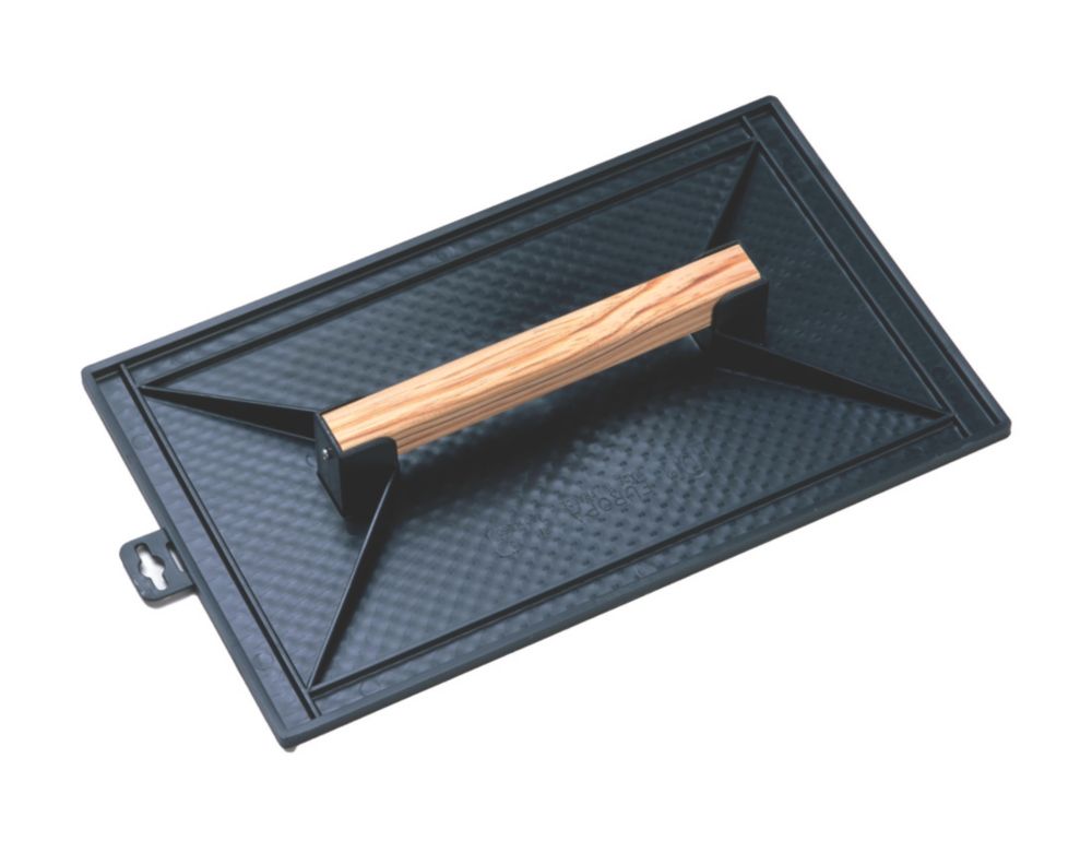 Taloche rectangulaire avec lame en nid d'abeille et grande poignée en bois.